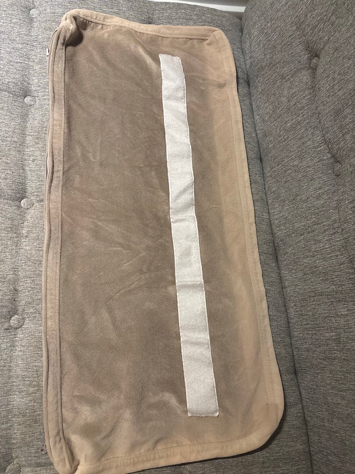 Bej renkte, yumuşak dokulu ve düz tasarımlı, ortasında beyaz şerit detaylı yastık kılıfı.