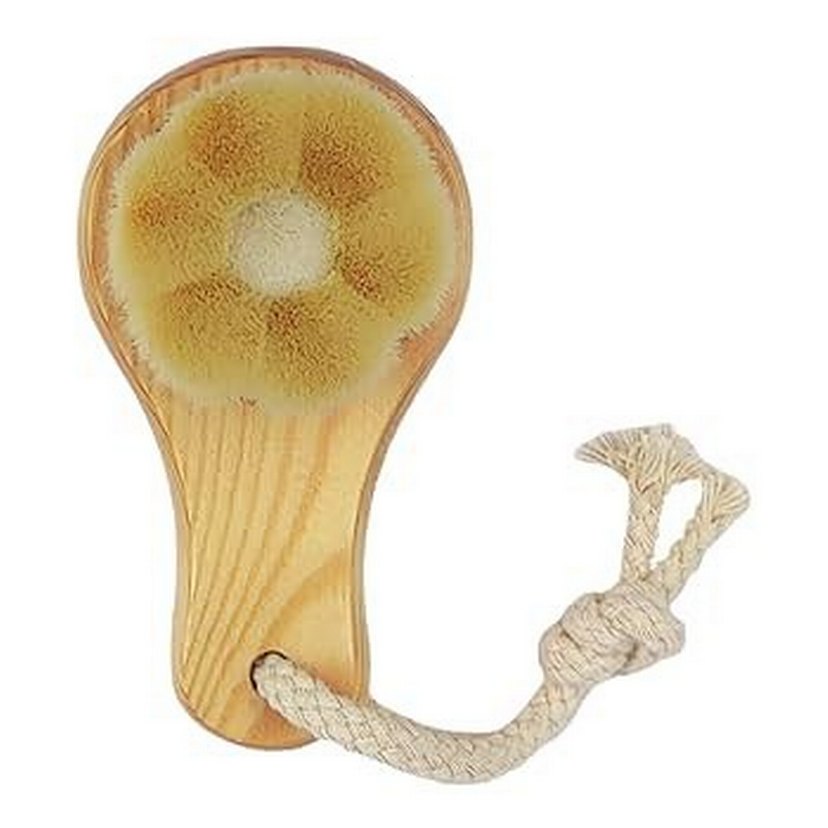 Yumuşak kıllara ve ahşap saplı bej yüz temizleme fırçası, kolay asma için ip halkası içerir.