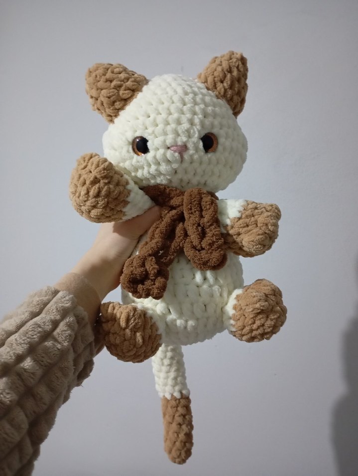 Pastel tonlarda, yumuşak dokulu bej renkli oyuncak kedi, üzerinde şık bir atkı ve detaylı yüz ifadesiyle.