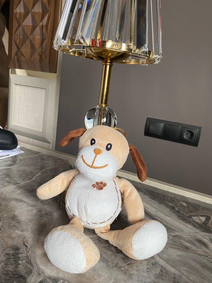Bej renkte, yumuşak kumaştan yapılmış ve nakış detaylara sahip peluş oyuncak köpek. Hafif tonlarıyla her odaya yumuşaklık katar. Hasarsız sevimli yumuşak deformasyonu ya da onarımı yoktur - sevimli bir uyku arkadaşı ya da dekor amaçlı ya da asma yerinden her hangi bir yere asılabilir