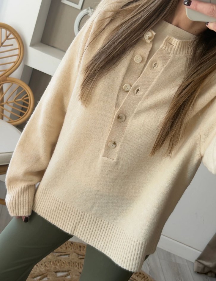 Bej yün kazak, düğmeli ön detay ve yüksek yaka ile. Uzun kollu, bol kesim rahat ve gündelik kullanıma uygun.