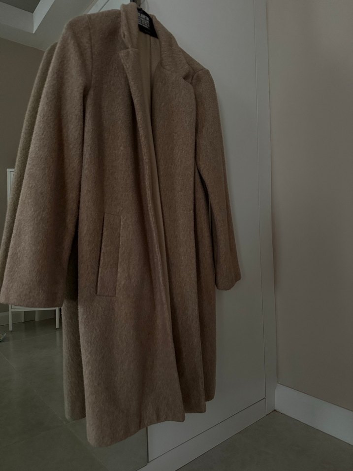 Yumuşak dokulu bej yün kaban, klasik yaka ve yan ceplerle birlikte.