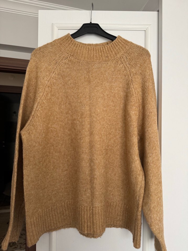 Bej yünden örülmüş, bisiklet yakalı, uzun kollu kadın kazak. Rahat kesim ve normal boyda, gündelik kullanım için uygundur. Deseni sade ve konforludur.