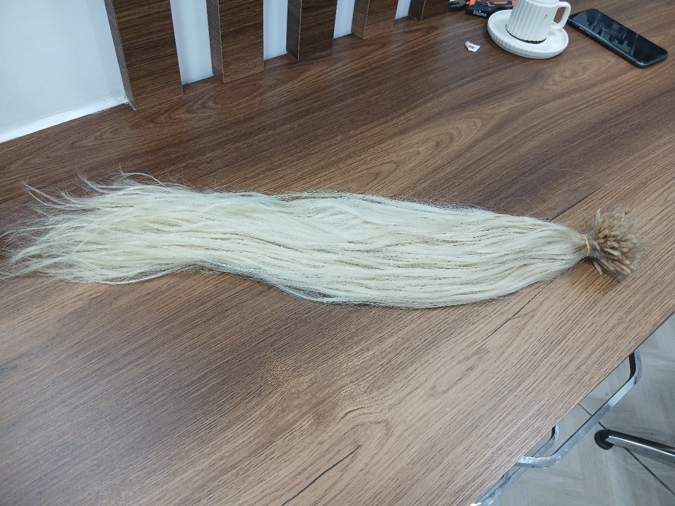 Bej renkte, yün malzemeden yapılmış, püsküllü bohem tarzda saç aksesuarı. Retro ve hippie görünüm için uygundur. doğal kaynak sac
