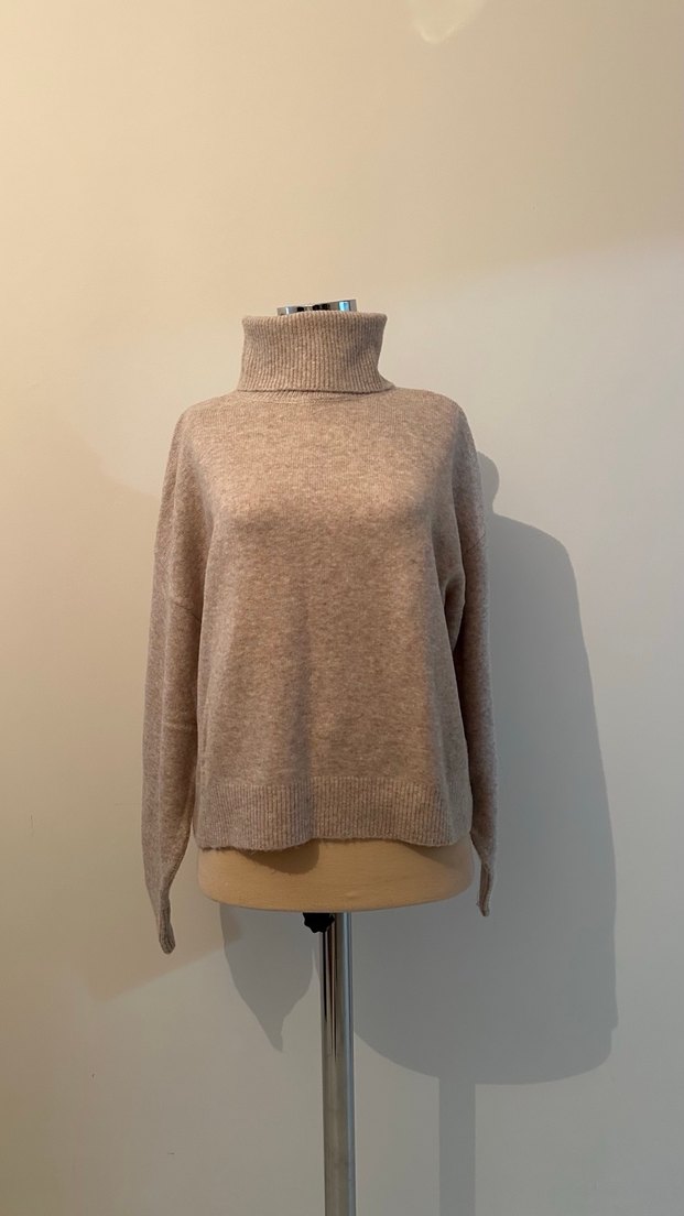 Bej renkte yün örme, yüksek yakalı ve uzun kollu kadın kazak. Bol kesim ve normal uzunlukta, desen içermeyen rahat bir tasarıma sahiptir.
