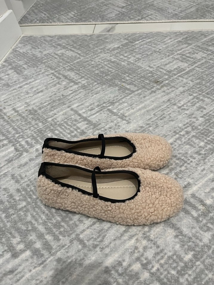 Bej renkli, yün ve kürk detaylı kadın düz ayakkabılar, düşük blok topuklu ve sade tasarımlıdır. Günlük kullanıma uygundur.