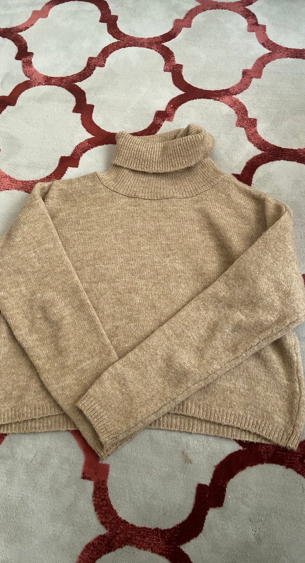 Bej renkte, yün örme kumaştan, boğazlı ve bol kesim uzun kollu kadın kazak. Günlük kullanıma uygun sade ve rahat bir model.