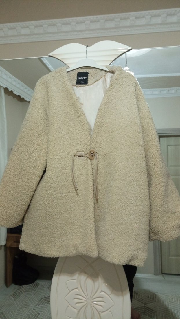 Bej yünlü, kürk detaylı, bol kesim kadın kaban. Uzun kollu, yakası kesik ve midi boyda, günlük kullanıma uygun rahat normcore tarzında.