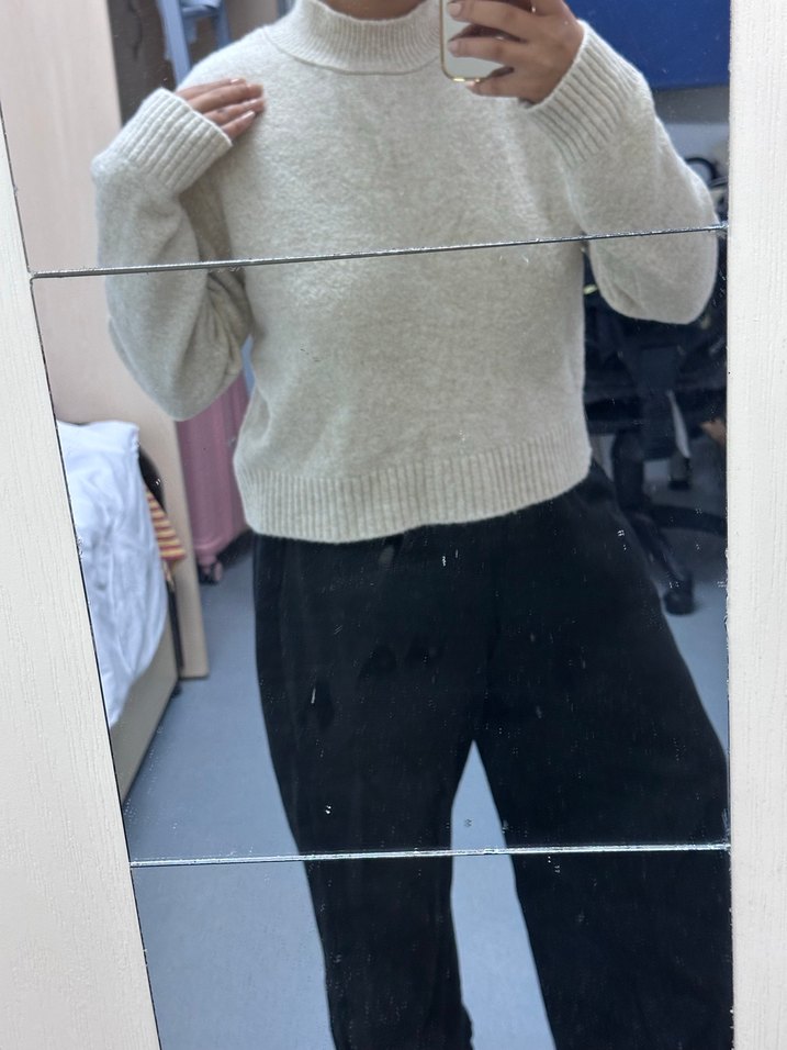 Bej renkte, yün kumaştan yapılmış, yüksek yakalı ve uzun kollu, bol kesim örgü kazak. Günlük kullanıma uygun, rahat ve sıcak tutar. 1-2 kere giydim çok iyi durumda.