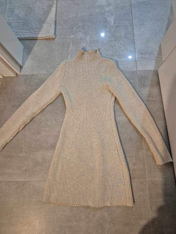 Bej renkli, yüksek yakalı ve uzun kollu yün triko elbise. Vücuda oturan kesimi ve midi boyu ile günlük kullanıma uygundur.