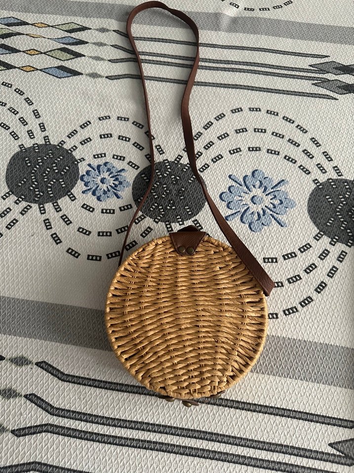 Uzun kahverengi askılı yuvarlak bej sepet çanta, günlük kullanım için ideal. Hafif ve doğal görünüme sahip.