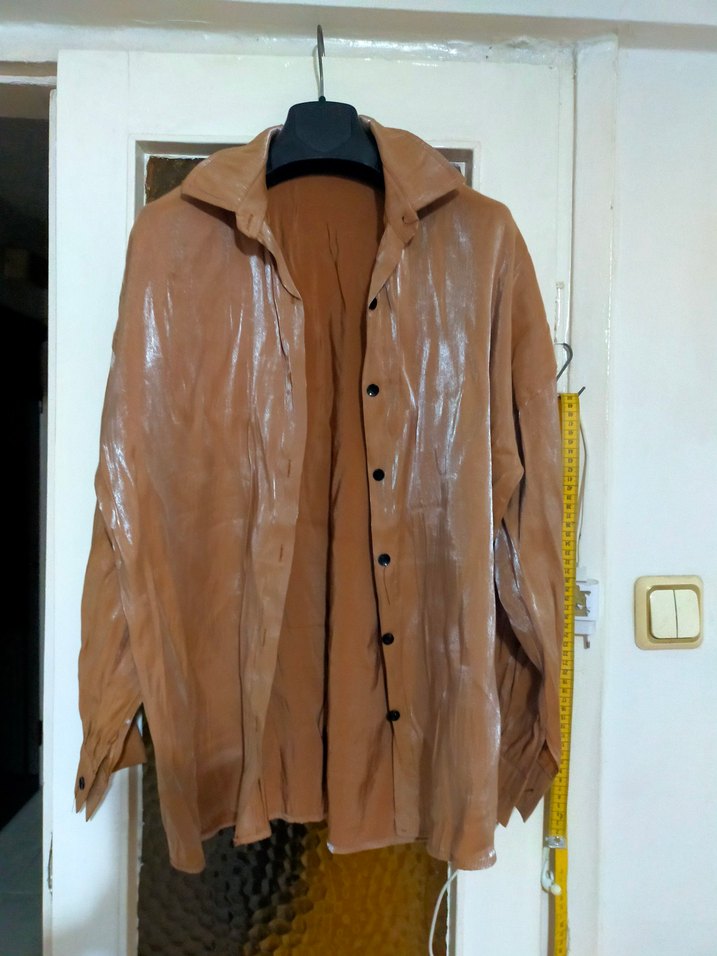 Salaş kesim, bej deri gömlek, yakası notchlu ve düğmeli. Uzun kollu, parlak yüzeye sahip, günlük ve sokak stili için uygun.