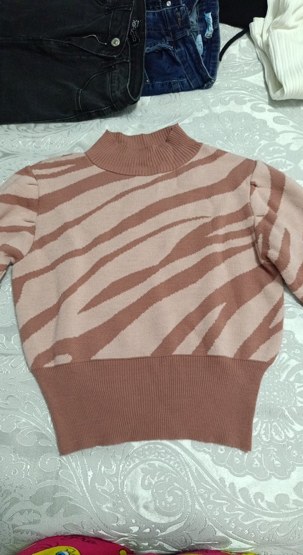 Bej renkte, zebra desenli, boğazlı, uzun kollu, normal boyda, ince örme kadın kazak. Günlük rahat kullanıma uygundur.