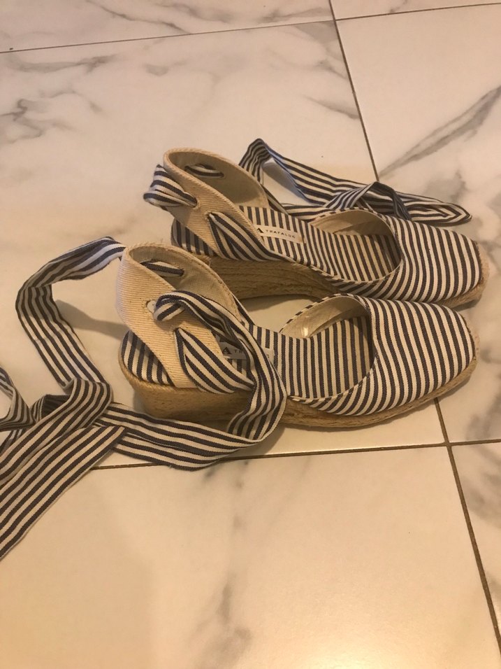 Bej zebra desenli, dolgu topuklu espadril ayakkabılar, kurdele bağlama detaylı ve kauçuk tabanlıdır. Günlük kullanıma uygun bohem tarzda.