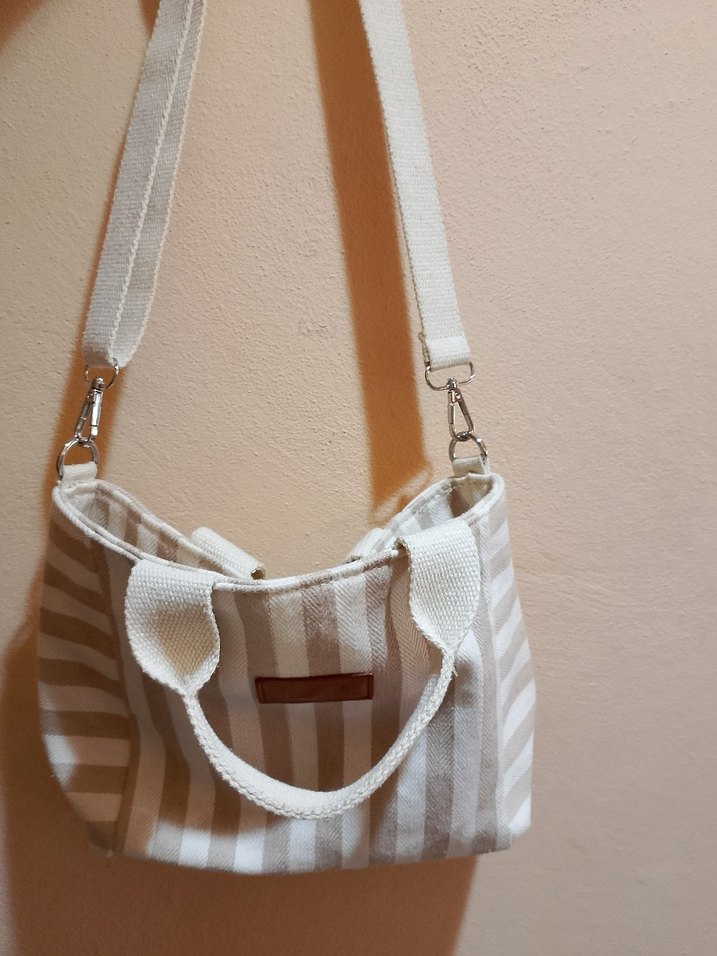 Bej zebra desenli, tokalı ve ayarlanabilir askılı sentetik kumaş kadın omuz çantası.
