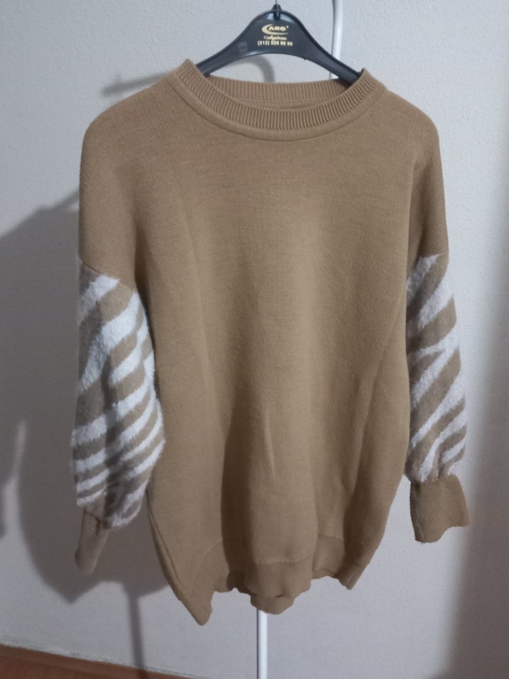 Uzun kollu, bej renkte, gri zebra desenli triko kazak. Yuvarlak yaka ve rahat kesimiyle günlük kullanıma uygun, salaş ve rahat bir stil sunar.