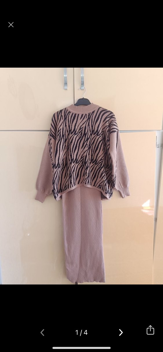 Bej pastel zebra desenli, uzun ve bol kesim kadın triko kazak. Yuvarlak yaka ve uzun kollu, yumuşak sentetik kumaştan örülmüştür. Günlük kullanıma uygun rahat sokak stili.
