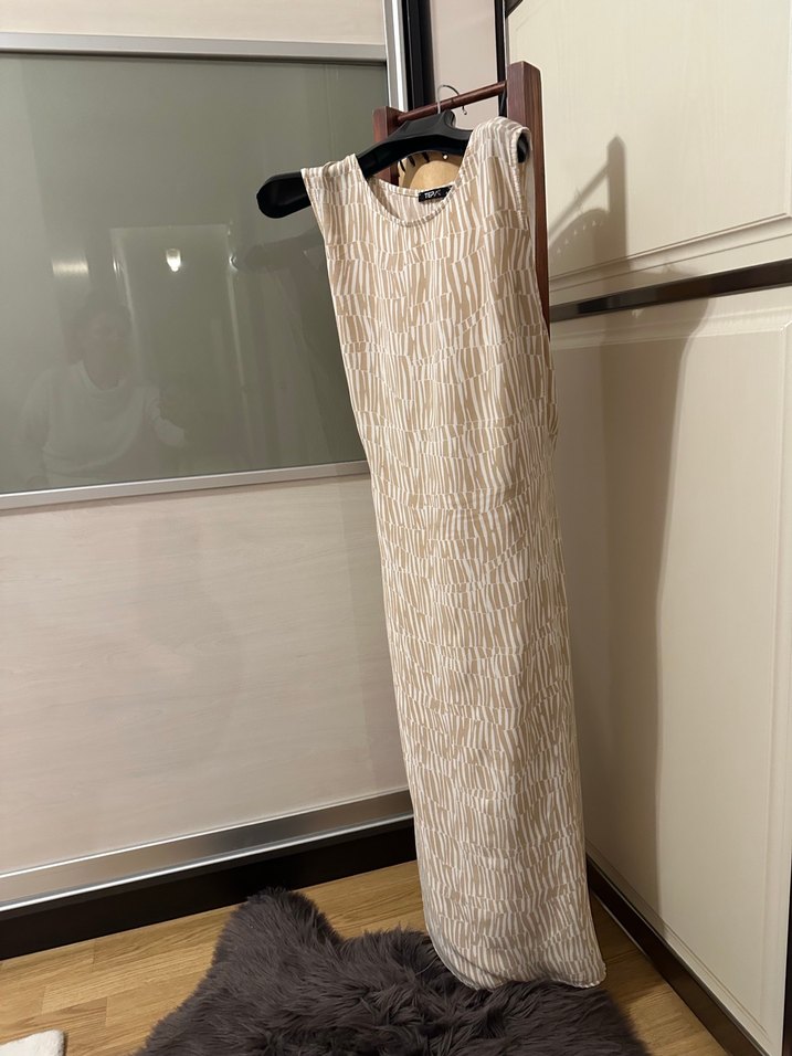 Bej ve gri tonlarda zebra desenli, kolsuz uzun keten elbise. Yüksek yaka ve dökümlü tasarıma sahip, rahat kesimli minimal ve bohem tarzda elbise.