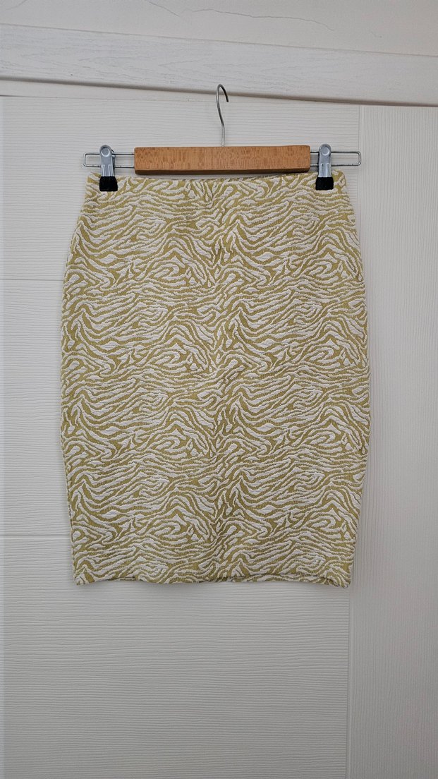 Bej zebra desenli, pilili ve fitted kesim midi etek. Yumuşak sentetik kumaştan, minimalist ve çağdaş tarzda, günlük kullanıma uygun.