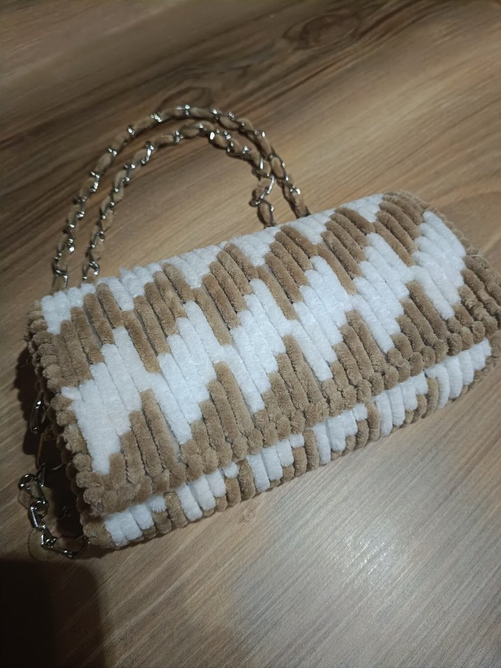 Bej renkte, örgü zebra desenli ve zincir saplı kadın çantası, kendi el emeğimdir. ufak tefek kusurları vardır elbette ama kullanmaya engel değildir.