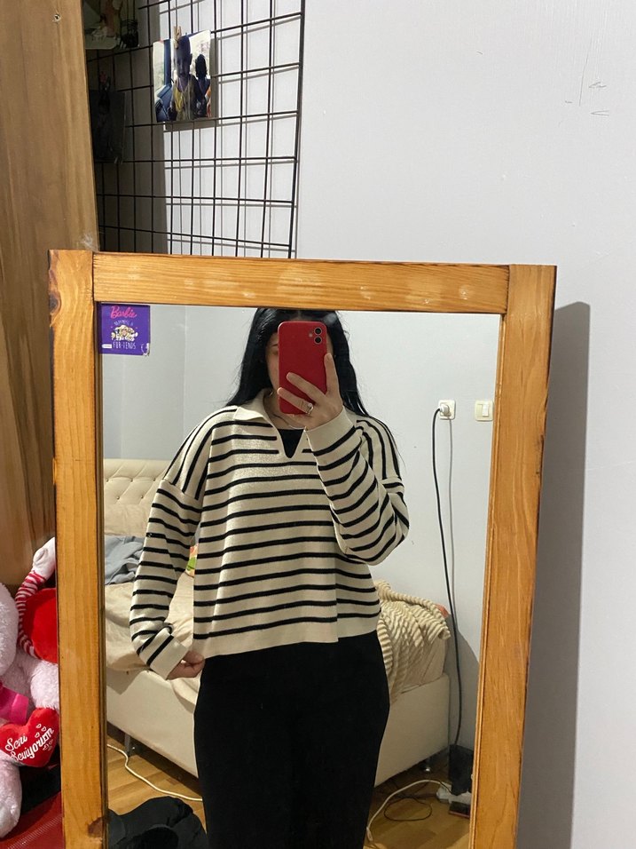 Bej renkli, yüksek yakalı ve uzun kollu kadın kazak, rahat kesimi ve zebra desenli örgü kumaşıyla günlük sokak stiline uygundur.