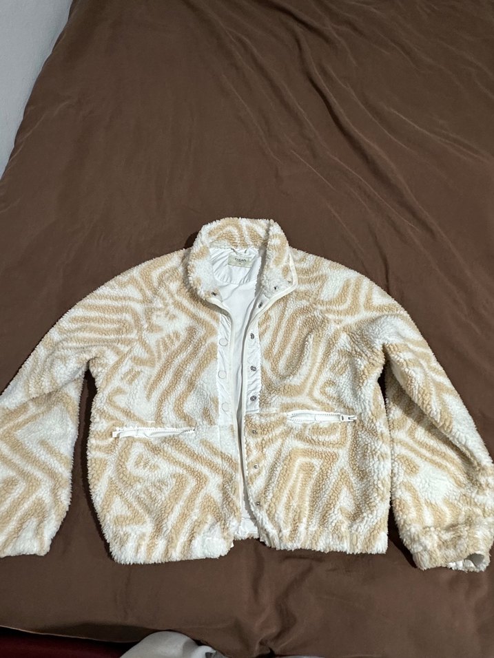 Bej renkte, zebra desenli, peluş detaylı, yüksek yakalı, uzun kollu ve bol kesim kadın ceketi. Yumuşak ve sıcak kumaştan, midi boyda rahat bir model.