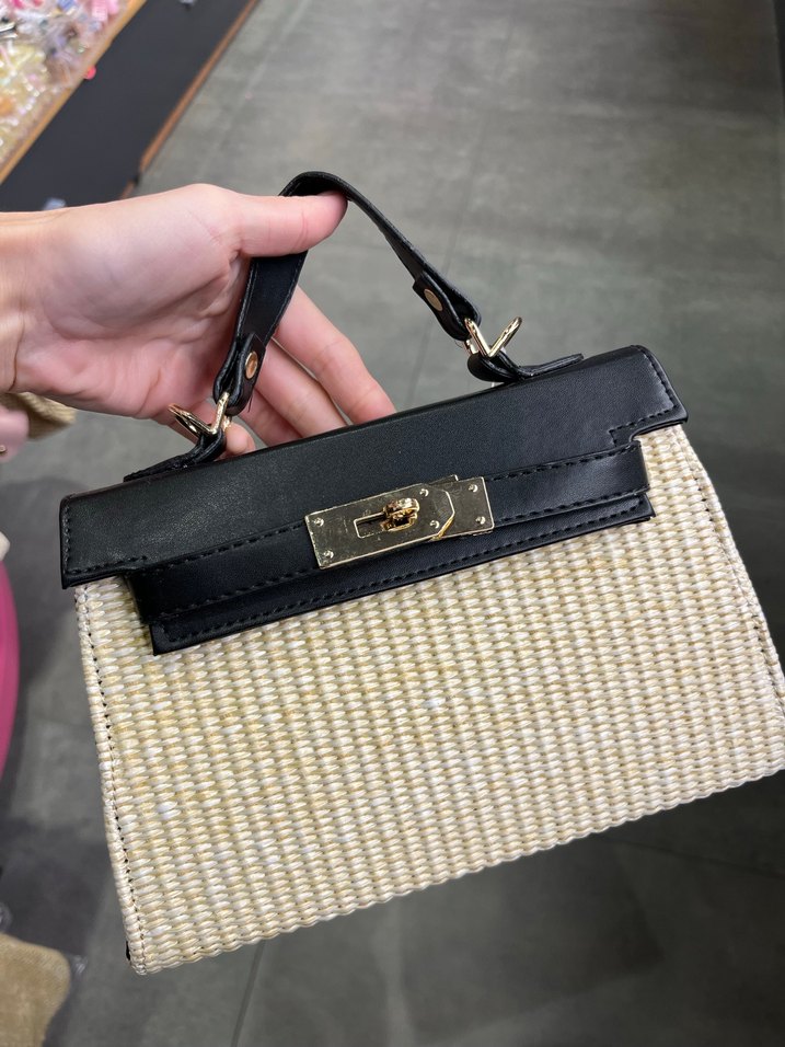 Bej zebra desenli, siyah saplı ve tokalı, sentetik kumaştan yapılmış klasik bohem tarzda kadın çantası.