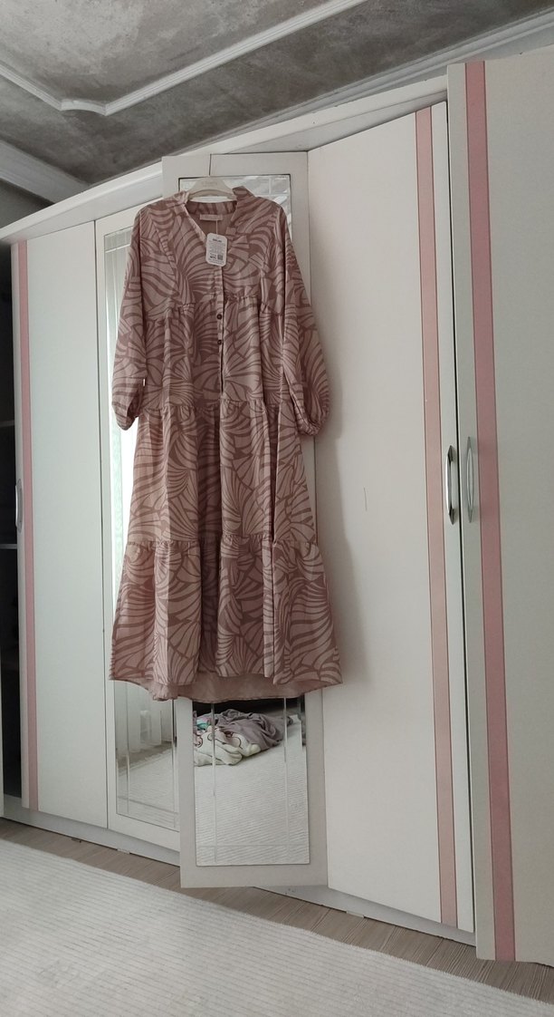 Bej renkli, zebra desenli, bol kesim uzun elbise. Uzun kollu, fırfırlı ve yüksek yakalı, yumuşak sentetik kumaştan üretilmiştir.