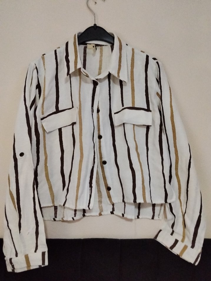 Bej keten gömlek, uzun kollu ve düğmeli yapısıyla zebra desenli. Salaş kesimi ve iki göğüs cebine sahip, günlük kullanıma uygun.