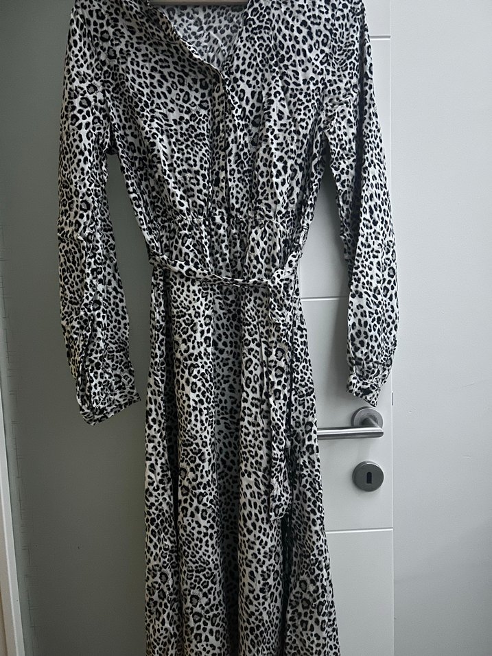 Bej zebra desenli uzun kollu, bol kesim, kemerli, V yakalı uzun elbise. Sentetik kumaştan, günlük sokak stili için uygun. Boy 125