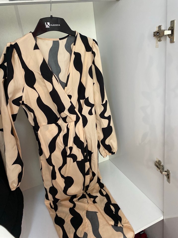 Bej ve siyah zebra desenli, V yakalı ve uzun kollu, sentetik kumaştan yapılmış, drapeli ve fit kesim modern tarzda uzun elbise.