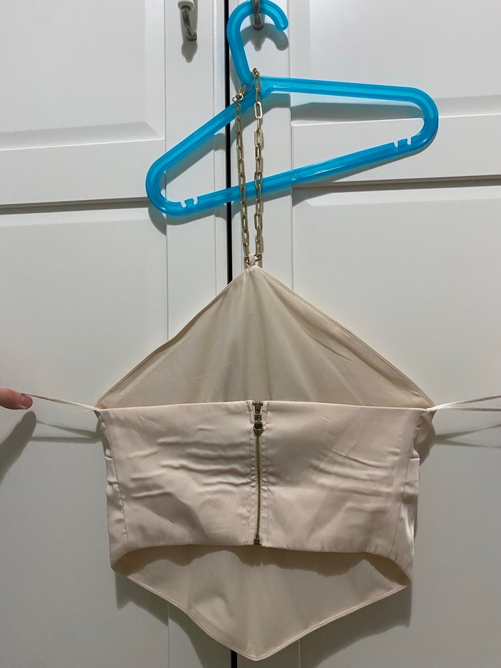 Zincir askılı, arka fermuarlı bej renkli, yumuşak kumaştan yapılmış bustiyer. Hafif ve şık tasarım.