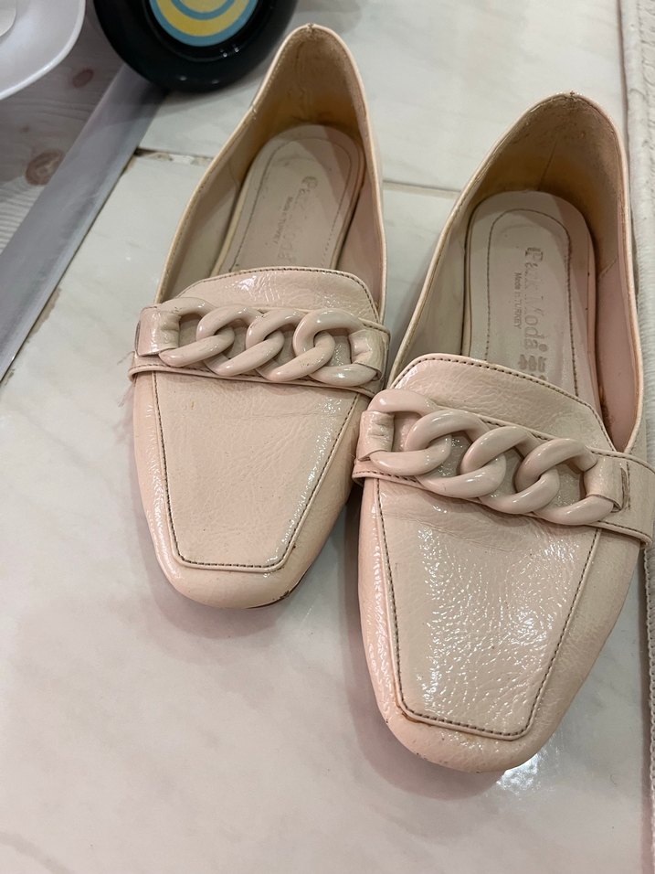 Yumuşak kauçuk malzemeden yapılmış, yılan desenli ve zincir detaylı bej blok kadın babet. Günlük rahat ve şık kullanım için uygun.