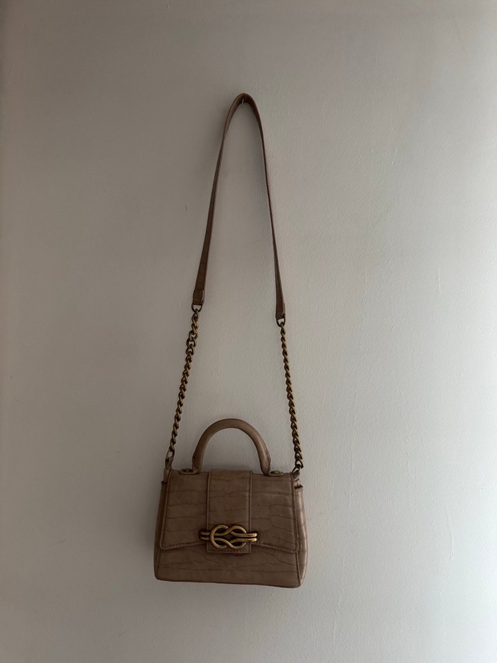 Bej deri yılan desenli, zincir detaylı çanta, modern klasik ve minimalist şıklığı günlük kullanım için sunar.