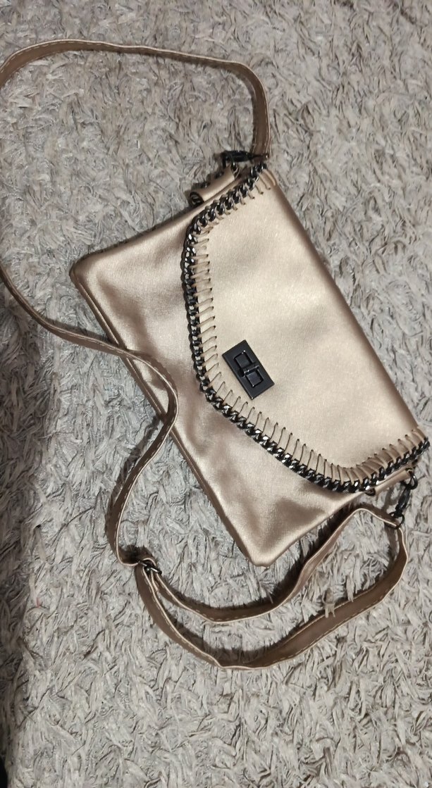 Parlak bej deri kadın çanta, zincir detayları ve nakış desenleriyle trendy casual ve bohem tarzlara uygun. Günlük kullanıma ideal.