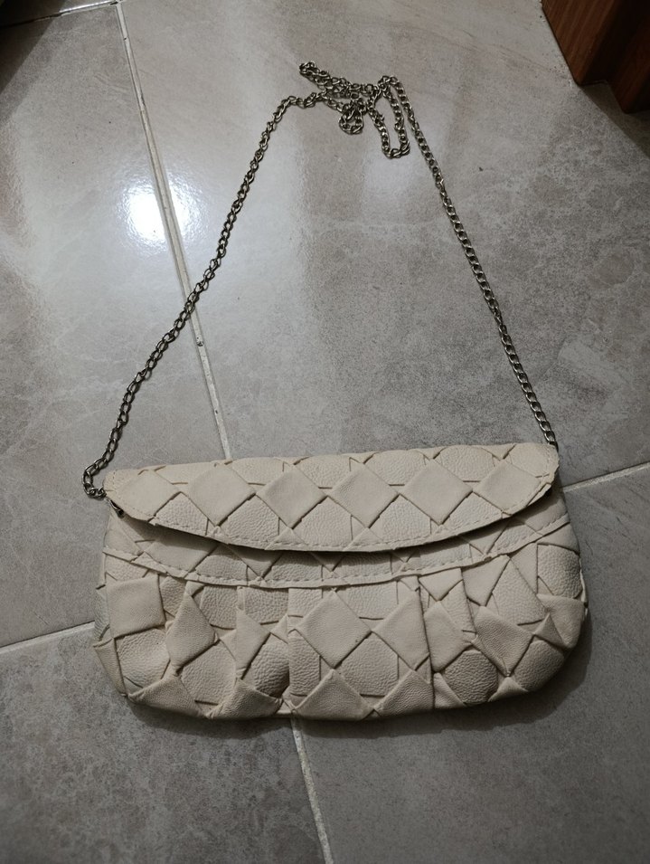 Bej renkli, zincir detaylı deri kadın çanta. Yılan derisi desenli, bohem tarzıyla günlük kullanıma uygundur. Krem rengi küçük boy kadın çantası, basic ve basit bir ürün günlük kullanım için idealdir, zinciri uzun ve hiç kullanılmanıştır. sıfır üründür