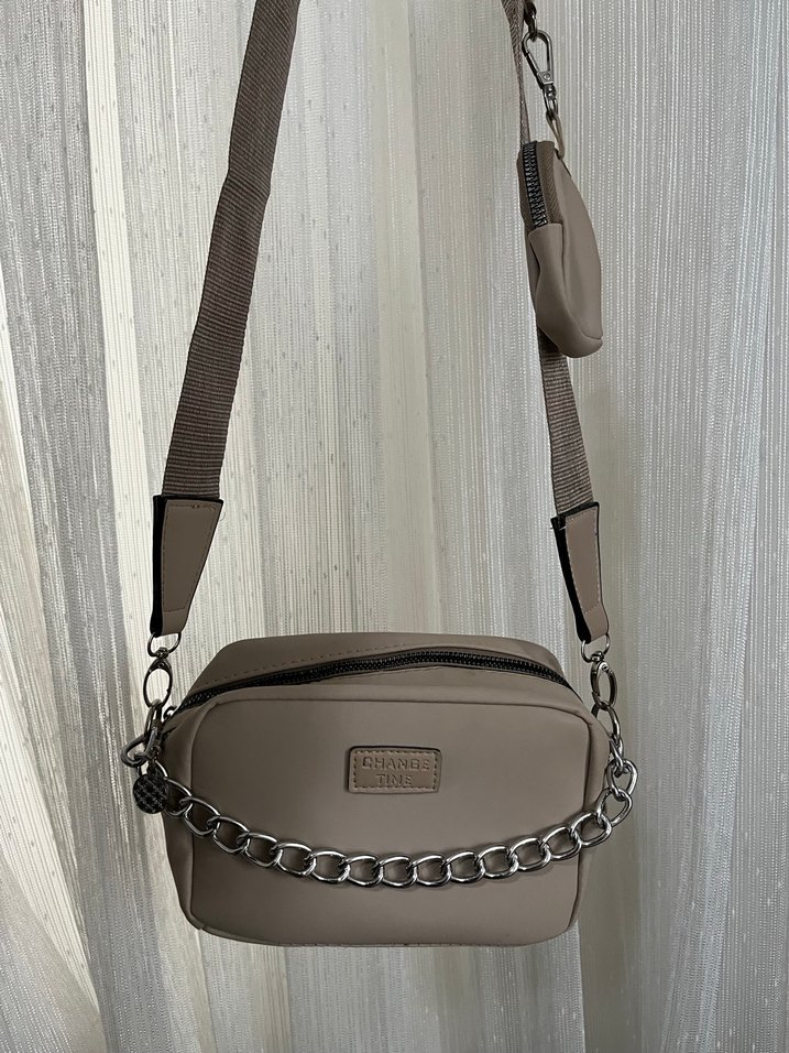 Bej renkli, zincir detaylı ve ayarlanabilir askılı deri kadın çantası. Gri tonlarda, desen içermeyen, günlük sokak stili için uygun.