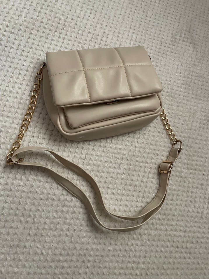 Bej renkli, zincir detaylı deri kadın çantası, sokak tarzı ve günlük kullanıma uygun sade tasarım sunar.