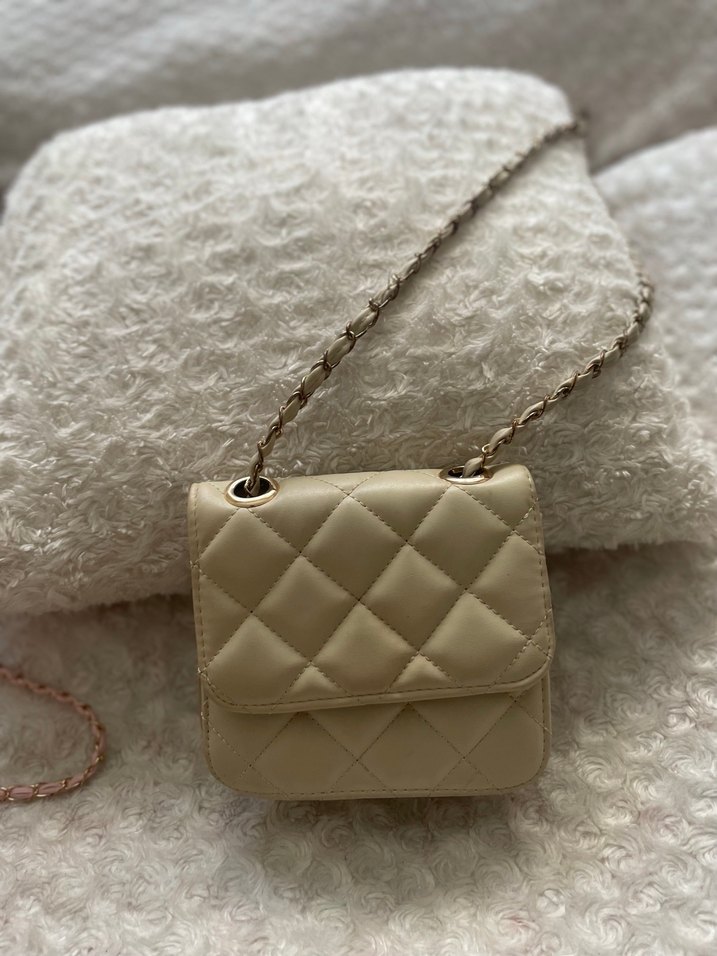 Zincir detaylı, bej renkli deri kadın çanta. Günlük sokak stili için klasik Paris şıklığı sunar. Pastel tonlarda ve desensiz tasarım.