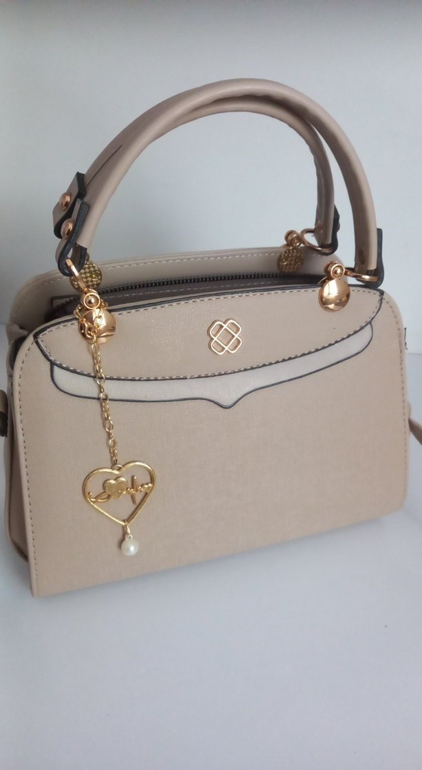 Bej renkli, zincir detaylı ve desenli kadın çantası. Günlük kullanıma uygun, çağdaş tasarıma sahip, altın renkli aksesuarlarla şık bir görünüm sunar. Sıfır ürün. Yerel bir butikte özel tasarımdır.