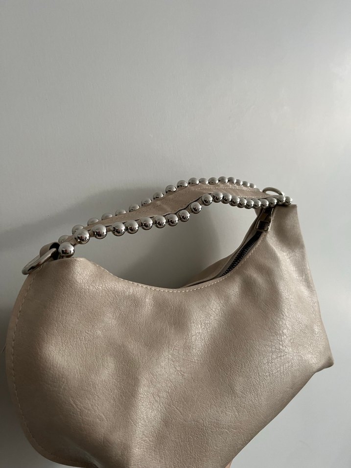 Minimalist tarzda, zincir detaylı bej deri kadın çantası, çağdaş stil ve günlük kullanım için uygundur.