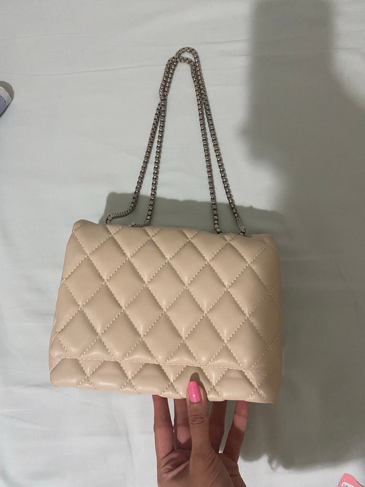 Bej renkte, zincir detaylı deri kadın çantasıdır. Kapitone tasarımıyla günlük kullanıma uygun, çağdaş ve şık bir görünüme sahiptir. Herhangi bir hasarı yoktur çok iyi durumda , butik ürünüdür