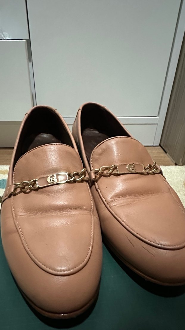 Bej renkli, zincir detaylı deri kadın loafer. Parlak yüzeyli ve blok topuklu, günlük kullanıma uygun.