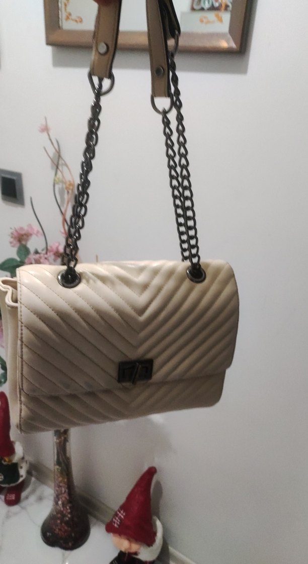 Bej Zincir Detaylı Deri Zebra Desenli Çanta