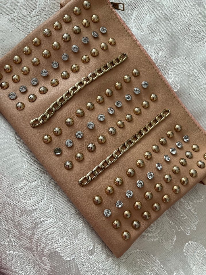 Bej renkte, zincir detaylı ve işlemeli parlak zımbalarla süslenmiş deri kadın çantası. Rock punk tarzıyla göz alıcı ve günlük kullanıma uygun. ✨ hafif solma var