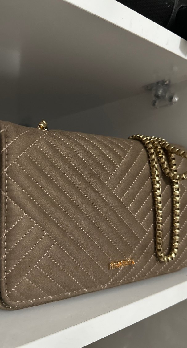 Bej renkte, işleme desenli çanta, altın zincir detayıyla modern klasik ve Paris tarzını yansıtıyor. Her gün kullanıma uygun.