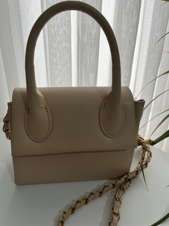 Bej renkte, zincir detaylı deri kadın çantası. Modern klasik tasarım ve pastel tonuyla günlük kullanıma uygundur.
