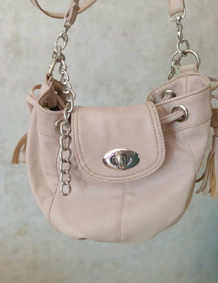 Bej renkte, zincir detaylı deri kadın çantasıdır. Düğmeli kapaklı, desen içermeyen bu çanta, günlük kullanım için uygundur.