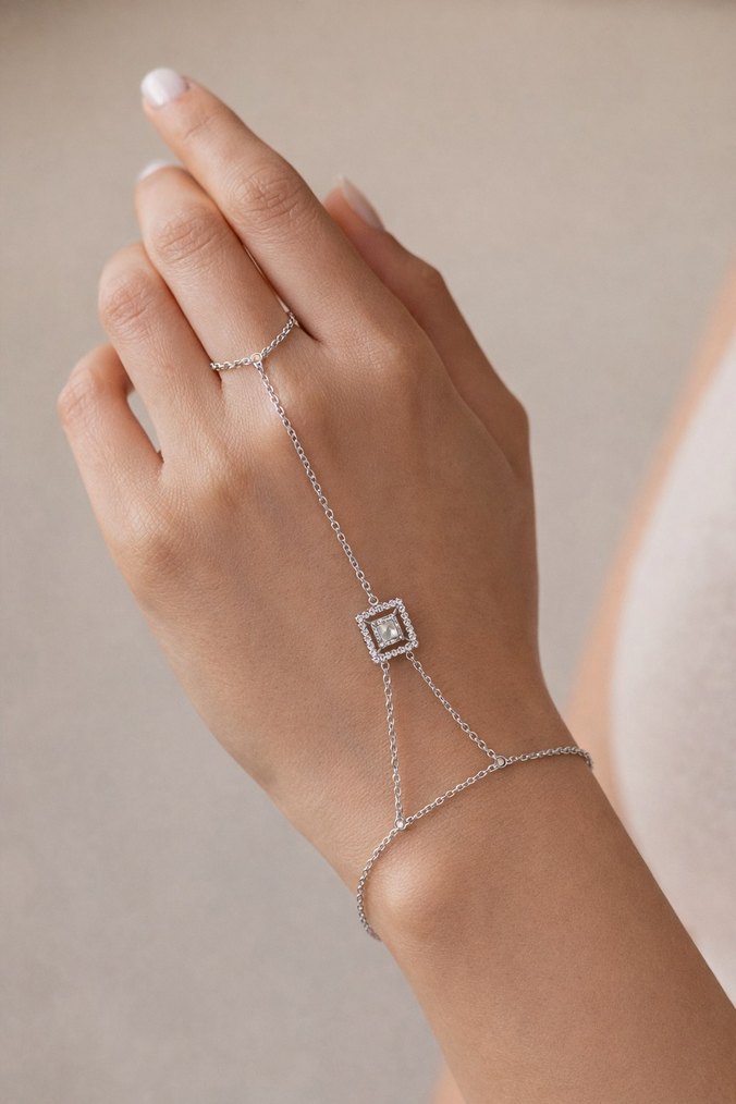 Bej renkte, zincir detaylı kadın el zinciri. Minimalist ve bohem tarzda, klasik zarafeti yansıtan sade ve hafif bir tasarım.