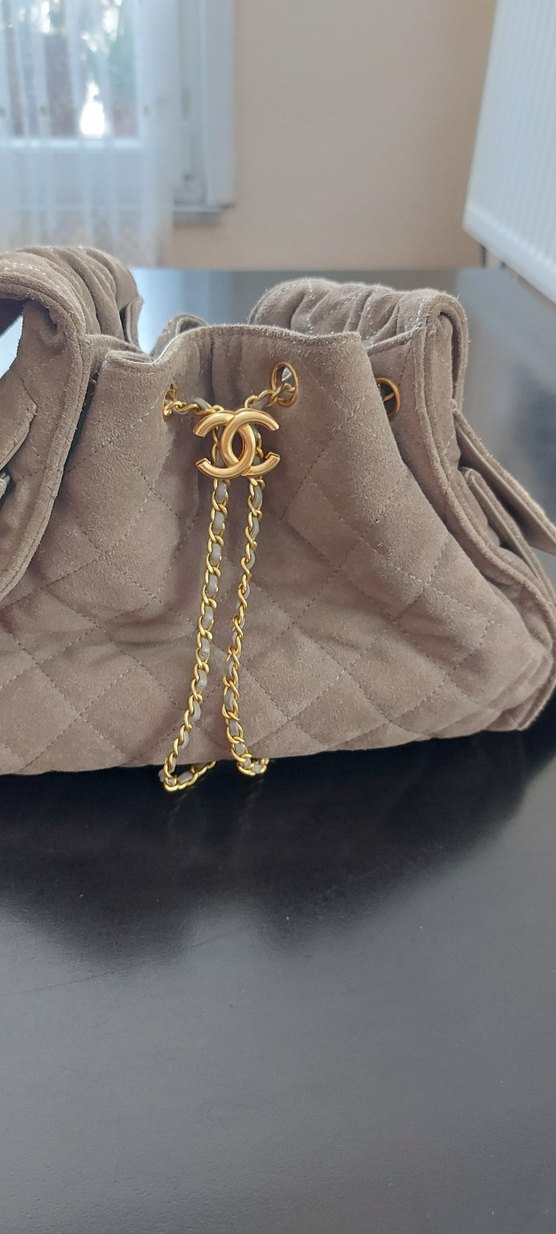 Bej süet kadın çanta, zincir detaylı ve kapitone desene sahip. Paris tarzı ve günlük kullanıma uygun. zincinin içinde ki deri kopuk çepte ufak defusu var